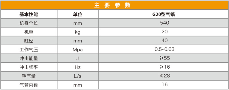 G20型氣鎬以壓縮空氣為動力,管狀分配閥將壓縮空氣輪流分配于缸體兩端,使錘體進行往復運動,將鎬釬打入工作物,致使分裂成塊。